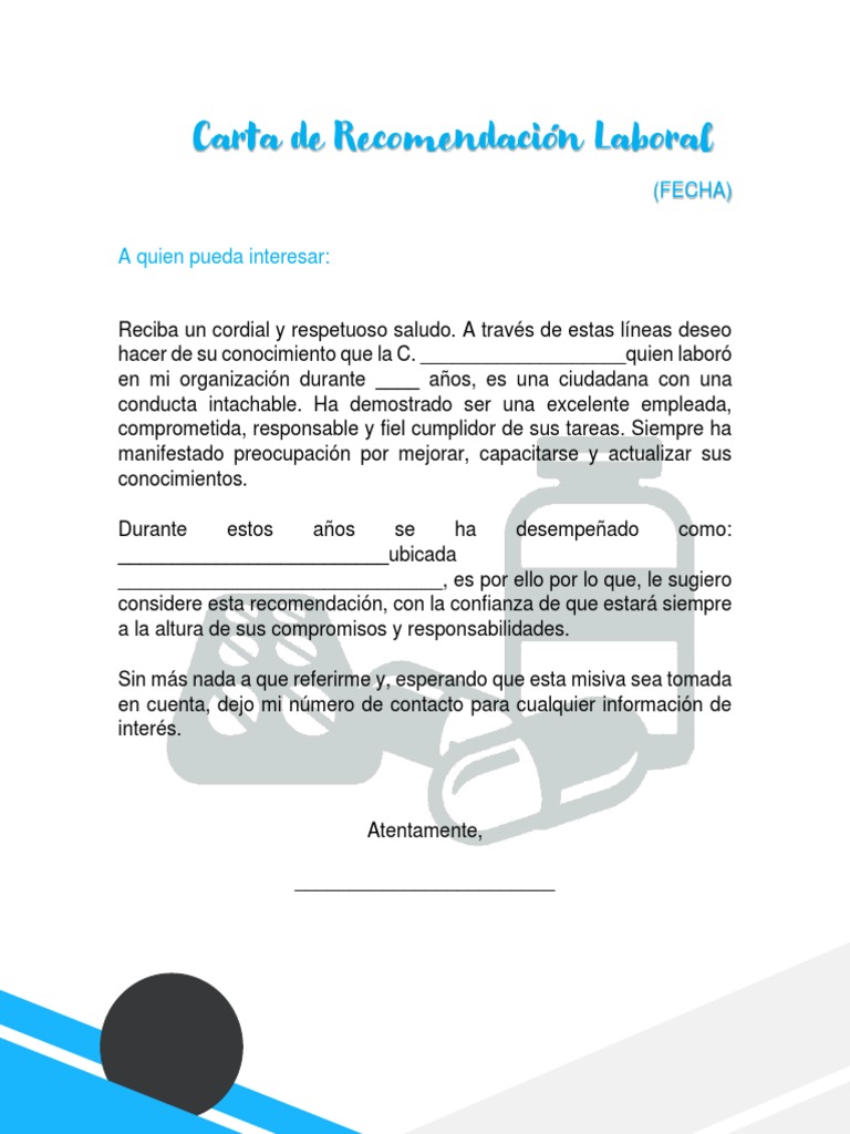 Si es primer empleo acudir a profesores de los centros de formacin. Carta de Recomendacin Laboral FECHA A quien pueda interesar. Si puedes usar nmeros para cuantificar su xito an mejor.